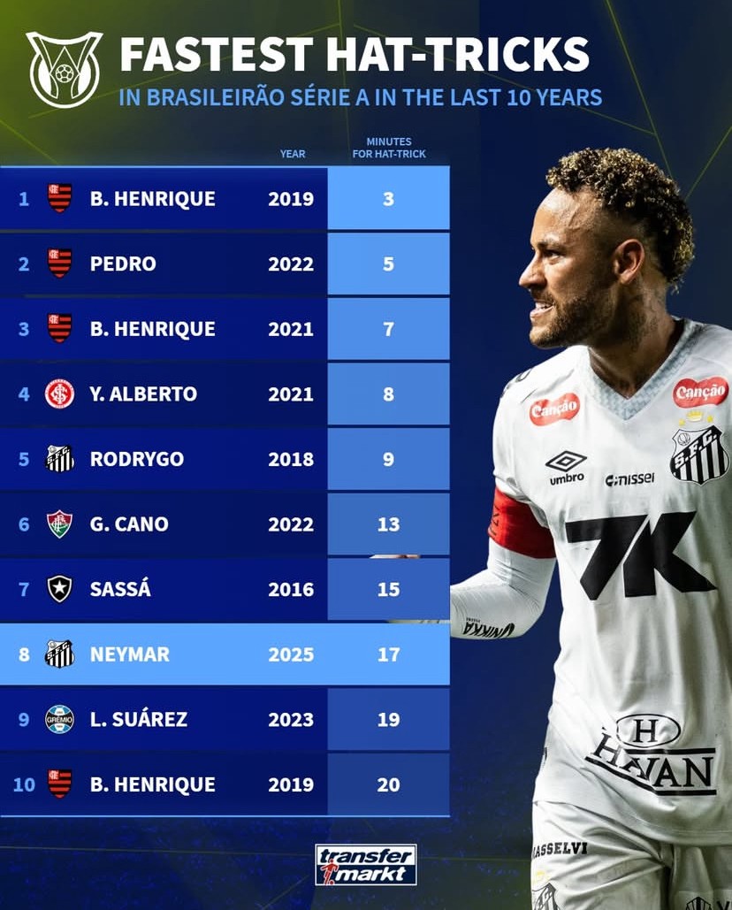 近10年巴甲最快帽子戲法:內馬爾17分鐘戴帽第8,羅德里戈上榜